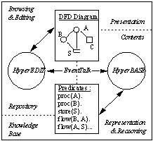 EventTALK is also responsible for advising HyperBASE of all user actions which cannot be interpreted within the context of the currently displayed document. The class of such events includes browsing and navigation events (clicking on a diagram component, e.g. a DFD process), which require access to the HyperBASE database storing inter-document linking information and of course the details of documents which are destinations for such navigating actions (e.g. links leading from the selected DFD process to the set of its refinement diagrams).