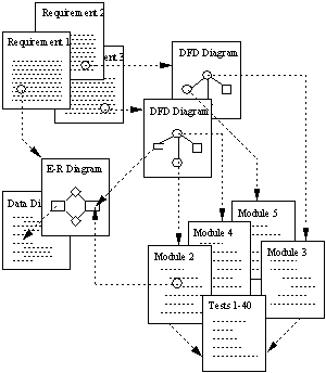 For example, a developer may, when viewing a process symbol in a data flow diagram, wish to display the code associated with the process, its representation in a state transition diagram, to inspect the relevant section of a (standard) Systems Requirement Specification document, or the corresponding paragraph in the feasibility description. All documents need then be stored and accessible simultaneously in a common document repository, thus forming a browsable network of software documents (Figure 1).